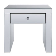 The Noralie End Table will give any room a touch of glamour. This contemporary end table is fully mirrored with a stunning mirror top and a faux diamonds inlay on each leg of its sled base. Use this unique piece as the perfect accent for any room Decor. One storage drawer provides ample and convenient storage for makeup brushes, jewelry, and more.