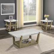 Transform your living room with the Marble Top Table Collection. Crafted with modern flair from veneers, hardwood solids, and exquisite marble tops, each piece exudes sophistication. The base from solid wood adds a touch of lightness, while the sturdy legs and clean lines introduce a primitive charm. Functionality is paramount, with built-in shelves on all pieces for convenient storage, perfect for keeping remotes close at hand.