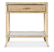 Inspired by tropical getaways, the Retreat Pole Rattan End Table is a mixture of natural materials in a laid-back, versatile design. Crafted of Oak and Maple Veneers with Rope accents at the joints, the table is finished in the sand-colored, transparent by design to showcase the unique grain patterns of the wood veneer. Finished on all sides, the table has one self-closing drawer, one fixed shelf and is accented by soft pewter-colored “T” pulls.