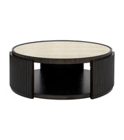 The Rivera Coffee Table showcases a contemporary design with elegant hints of glamour. Its round, open-frame structure features reeded detailing in a chic charcoal oak finish, perfectly complemented by gold-tinted antique mirror insets on the top. The design not only enhances visual interest but also adds a sophisticated touch to any space. Equipped with casters, this coffee table offers effortless mobility, making it a practical yet stylish addition to your living area. With its modern aesthetic and luxurious accents, the Rivera Coffee Table is sure to elevate your home decor.