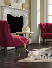 With its slender shaped iron legs in a gold finish and organic Travertine top and petite footprint, this metal-and-natural-stone accent table is the perfect piece of jewelry for your room.