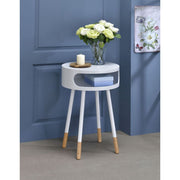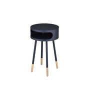 This Sonria round end table offers a contemporary take on a stylish retro design, ideal for your living room, family room, or bedroom! With its one shelf, you can conveniently store remote controls or other small items in the open compartment. The natural wood featured at the base of the legs provides that extra flare to bring any room together. Some assembly required.
