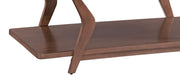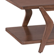 The Stratton Cocktail Table features a Mid-century modern influenced design. The architectural inspired silhouette features an angled frame and one shelf for storage. Finished in a rich brown walnut.
