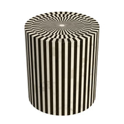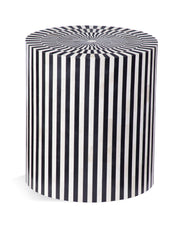 The Teague Accent Table features a cylinder shape with black and white bone vertical striping. Natural bone is a product of nature and is completely unique. The natural material is subject to variations in characteristics.