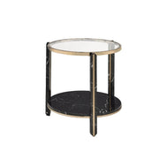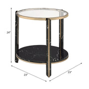 A luxurious modern piece that's also simple and chic, the end table features a round table top with three supporting legs. Champagne gold trims lend a sleek finishing touch and make the table look extra-stylish. Glass table top adds visual depth and interest to the design, while an open bottom shelf in faux black marble under the top is a great place to display your magazine collection or other decorations.