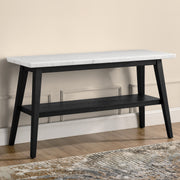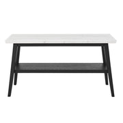 - Styling details include knife edge marble top, canted solid wood legs and bottom shelf for storage or display