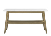 A beautiful knife-edged marble top highlights the elegance and simplicity of design in the Vida Sofa Table. Part Mid-Century, part Scandinavian Contemporary, this Sofa Table is clean, airy and perfect for today’s neutral interiors with its clean lines. Use behind a Sofa, in the hall or as a smaller entertainment unit, anywhere you have a need for simple but elegant decoration and functional design.