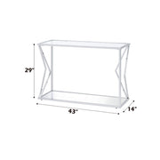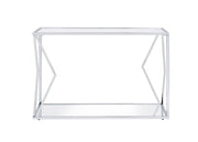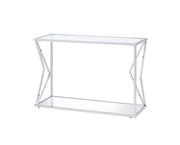Full of sleek, visually-appealing lines, the sofa table exudes a clean and open design. Sturdy metal frame features ultra-clean lines and a contemporary aesthetic, with a chrome finish enhancing the metallic textures. Clear glass table top and bottom shelf allow light to filter into and through the whole table, making it an irreplaceable centerpiece to brighten your living room.