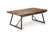 This Coffee Table strikes a modern profile with mixed media components in a silhouette great for industrial or eclectic environments. A modeled cinnamon finished top is arranged in a beautiful parquet pattern that adds texture to any room The canted iron base is arranged in a double sled base with an aggressive profile that demands attention. As a centerpiece of a room, this table fits the bill with style and craftmanship that warms a room.