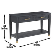 A sleek modern Console for a hallway or behind a Sofa, the Yves Sofa Table adds beauty and dimension to any room. Tapered legs and brushed brass accents make for a contemporary design with the added plus of two fully functioning drawers that add handy remote storage to any room.