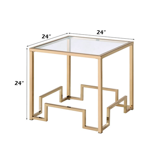 Damien - End Table - Clear Glass & ChampagneProduct Features KD, Square Table w/Geometric Metal Base Top: 5mm Clear Tempered Glass Frame: Champ...