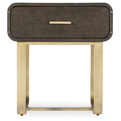 The Metropolitan End Table is a soft modern silhouette combining Oak Veneers in a dark wood finish with a rounded gold metal base and accents.Produ...