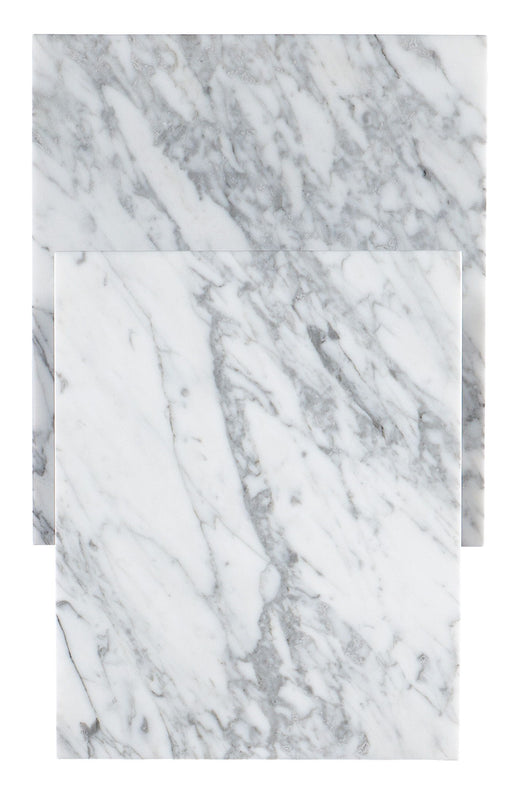 With a convenient C-shape to enhance versatility, the two-tiered Georgia side Table combines Pewter Metal on the base with a Carrara Marble white a...