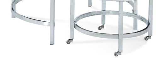 The Jadyn round cocktail features a cocktail with a clear glass top and a nesting table with a solid stone top and piano casters. Jadyn - Round Nes...