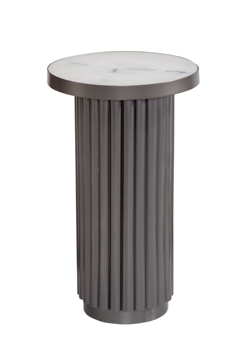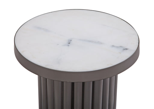 Dillion Accent table features modern styling with a fluted base constructed with aluminum in a cool, pewter finish. The inset top is solid white In...