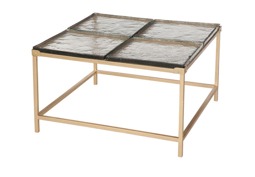 The Corina Scatter Table features a thick, poured glass top that sits inside iron frames with campaign style corner clips. The iron metal table fra...