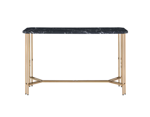 An elegant Sofa Table with a glamorous profile to dress up any room. A lustrous black faux-marble top complements the golden champagne iron legs in...