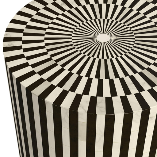 The Teague Accent Table features a cylinder shape with black and white bone vertical striping. Natural bone is a product of nature and is completel...
