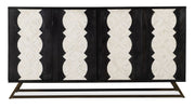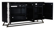 Eclectic, modern and sophisticated, the Moroccan Modern Credenza has a natural black wood finish over Mango Solids with a bone inlay design on the door fronts. An antique gold metal base adds to the mixed media appeal. The 4 doors have touch latches, and there are two adjustable wood shelves behind each pair of doors, along with a ventilated back panel and wire management.