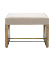 The Laurent Accent Stool features a distinctive V-cut pattern on its base, complemented by a sleek brass crossbar for added elegance. Upholstered in a neutral light fabric, it offers both style and comfort. This versatile piece blends modern design with subtle sophistication, making it a perfect accent for any space.