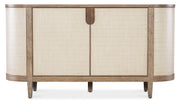 Crisp and current like fashion apparel, the Mélange Arbor Credenza has a two-tone neutral color palette combining Oak Veneers in a medium wood finish on the frame, top and legs with a contrasting canvas crackle in a parchment color on the doors and sides. The two doors have soft-close hinges and magnetic door catches. One adjustable shelf behind the doors.