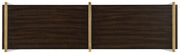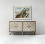 Black Walnut Veneers, metal and glass blend together in a mixed media medley to create a look of refined organic elegance in the Classic Credenza. The earthy color palette combines dark wood, cream and gold in the quatrefoil pattern on the front, the hardware and the metal base. Four doors with decorative glass with one adjustable shelf behind each pair of doors. Ventilated back panel.