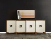 The Mélange credenza has four doors with large square hardware. It can also be used as an entertainment console.