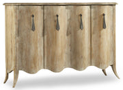 Curvy and couture, the swanky Draped Credenza has a fashion flair with its tassel-like hardware, shaped front and apron and delicate cabriole legs. Crafted of Elm Veneers in a light wood finish, the piece has two sets of doors with one adjustable shelf behind each pair of doors. The ventilated back panel accommodates media usage.