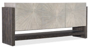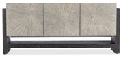 With gravitas and organic elegance, the modern Ground Perspective Credenza is crafted of Paldao and Oak Veneers with a natural distressed dark wood finish on the base contrasting with a light natural wood finish on the door fronts. A starburst pattern on the door fronts adds flair. The three doors have soft-close hinges and magnetic door catches, and there’s one adjustable shelf behind each door and one fixed shelf. Media-friendly, the credenza has a 3-plug outlet behind the center door and a ventilated back panel.