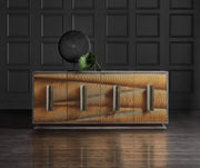 With an earthy and exotic elegance, the Mélange Swaley Four-Door Credenza is a striking silhouette with a dramatic gold swirl motif on the front, accented by dramatic curved vertical rectangle-shaped bronze hardware. Crafted of Oak Veneers and Resin, the credenza has 2 adjustable shelves behind each pair of doors, a ventilated back panel with wire management and a power supply
