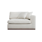 The Rue chair features a generous 70% feather-fill topper within its seat, accompanied by two toss cushions for an added layer of coziness. Its elegant silhouette is highlighted by a rubber wood base, creating a sleek floating appearance, all supported by subtle wooden legs. Designed with extreme comfort in mind, this modular chair embodies easy, neutral styling.