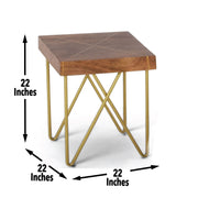 Solid mango wood in a warm pine finish is inlaid with a brass X pattern atop a modern brass finished iron base. Simple yet so stylish.