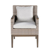 Enjoy the the great outdoors with the Marina hand-woven Arm Chair. All-weather resin and solution-dyed acrylic cover make this chair weather and fade-resistant to withstand whatever the elements dish out. The powder-coated aluminum base and arm caps are naturally rust-resistant so you can relax. The two-tone driftwood finish is neutral with a small punch of color and the chair is just the right scale and pitch to be perfectly comfortable. Use as a standalone chair or pair with the Marina dining collection for a complete outdoor dining set.