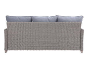 Enhance your outdoor living space with the Greeley patio sofa set. Place by a pool for the ultimate relaxing summer day with friends and family. Clean lines, low profile, minimalist, and fabricated in a subtle and elegant gray fabric and gray wicker with all components chosen to withstand moderate weather and humidity.