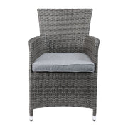 Assembled, 3Pc Pack: 2 Arm Chairs & Side Table NO Storage Trapezium Table w/Glass Top Arm Chairs (High Backrest) Stationary Seat: Standard Dining Height Padded Seat: Gray Fabric, Reversible Cushion, Water Resistant (Removable Cover-Zipper), Cushion Size: 2 Inches Thick (5cm) Armrest: Thin, Slightly Flared Metal Round Leg: Aluminum Powder Coated CONSTRUCTION: Table Top: 5mm Clear Tempered Glass (NOT Beveled), Gray Finish Flat All-Weather Wicker (8 x 1.3mm) Chair & Table Frame: Gray Finish, Flat All-Weather Wicker (8 x 1.3mm) & Aluminum Powder Coated (Chair ᴓ25/16 x 1.2mm, Table ᴓ24/22 x 1.2mm)