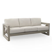 Neutral contemporary style in an outdoor set that will make your patio a showcase. This Sofa looks like it was sculpted for the great outdoors with beveled end panels that frame a modern geometric pattern. And although it looks like an indoor upholstery set, this group is built for the outdoors with rust resistant aluminum frames, solution- dyed acrylics and fast-drying foam cushions.