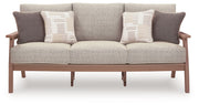 Natural neutrals are all the rage. Embrace the style trend with this outdoor sofa. Crafted of MEGA-TUFF® HDPE material, this chair combines the exceptional durability and weather resistance you need with the wood look you love. Comfy cushions wrapped in our high-performing, low-maintenance Nuvella® fabric offer stylish and durable appeal, taking outdoor living to a whole new level. Coordinating accent pillows add a wonderful layer of interest.