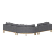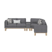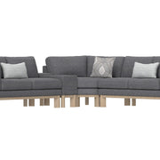 If you thought amenities were only for motion furniture, think again. The completely stylish Maeve collection offers a console with hidden storage, stainless steel cupholders, a wireless charging station, and a wireless speaker with USB chargers. An extra-wide, barrel-shaped accent chair is accompanied by a matching barrel-shaped storage ottoman. The spacious wedge of the sectional makes for extra cuddling space, while the gorgeous dark gray fabric sits atop a warm-toned exposed wood base. Get the whole package with the Maeve collection.