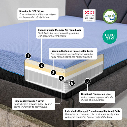 Renew your body even more with the added breathable, contouring comfort of sustainable Talalay latex. This 3-layer copper infused air foam and Tala...