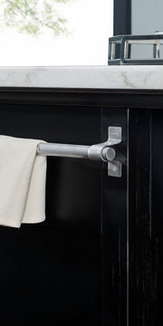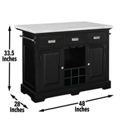 The Aspen Kitchen Island is sure to be your hub for all kitchen activity with its vintage styling and modern edge. Features abound with a luxurious marble top, storage drawers, cabinets, wine rack, stemware storage and more! The pewter cup hardware and towel rack accent the ebony wood finish for a piece that will add beauty and function to your home for years to come.