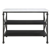 Minimalistic design paired with clean, simple color. The Brahm Kitchen Island gives off a light and airy feel to a compact cooking space. Clean-lined metal frame is topped with a artificial stone top, creating a sleek, modern silhouette that gives your kitchen an open feel. Spacious rectangular table top with two tier shelf provides more countertop space and storage. Use this stylish yet functional addition to complete your kitchen decor.