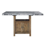 Rustic charm meets modern elegance in the Grayson Gray Marble Top Counter Dining Set, . to create a dining experience as rich and layered as your favorite vintage wine. A stunning 60-inch table is the centrpiece, with its natural pine offering hidden storage base to keep your dining essentials close at hand, ensuring every gathering flows seamlessly. Nestled around the table are six chairs upholstered in a soft, easy-care polyester. Their shield backs offer a cozy embrace, inviting you to linger long after the last bite is savored. The 24-inch counter height fosters intimacy, creating a space for whispered secrets and shared dreams. Dine in elegance, linger in comfort. This is the Grayson.