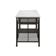 The Lanzo Kitchen Island is equally ideal for counter space or an excellent choice for display with extra storage. Blending contemporary style with industrial charm, the design is both stylish and functional. The metal frame adds a touch of industrial impression to the modern marble top style. Featuring four open shelves this is a must-have for every home.