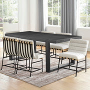 Upgrade your dining space with this sleek and modern 7-Piece Dining Set, featuring the Yves 77-95" inch Dining Table with a striking wire-brushed finish and six Nicco Side Chairs. The Yves Table combines style and function, featuring a contemporary double pedestal base and solid mango wood legs.